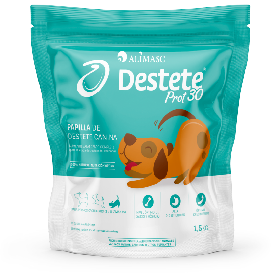 DESTETE es un alimento completo y equilibrado nutricionalmente para cachorros que comienzan a abandonar la lactancia (3 a 12 semanas). De un buen destete depende la buena salud y desenvolvimiento de los cachorros en la vida adulta. Durante esta fase DESTETE permite una suave transición de la leche materna a una alimentación sólida, siendo ésta, rica en proteínas, grasas, minerales y vitaminas que los cachorros precisan para una excelente alimentación.