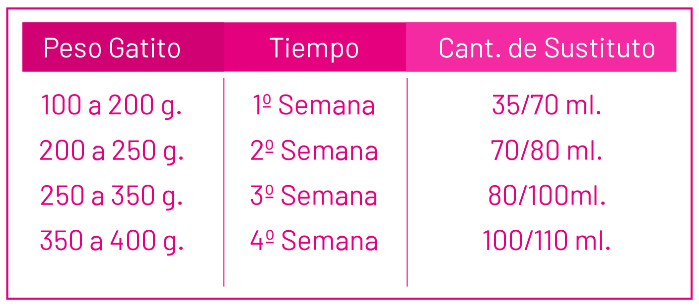 • La forma adecuada para suministrar el sustituto lácteo hasta las 3er semana de vida del gatito es mediante una mamadera provista con tetinas intercambiables de caucho, luego utilizar un recipiente con bordes bajos.
