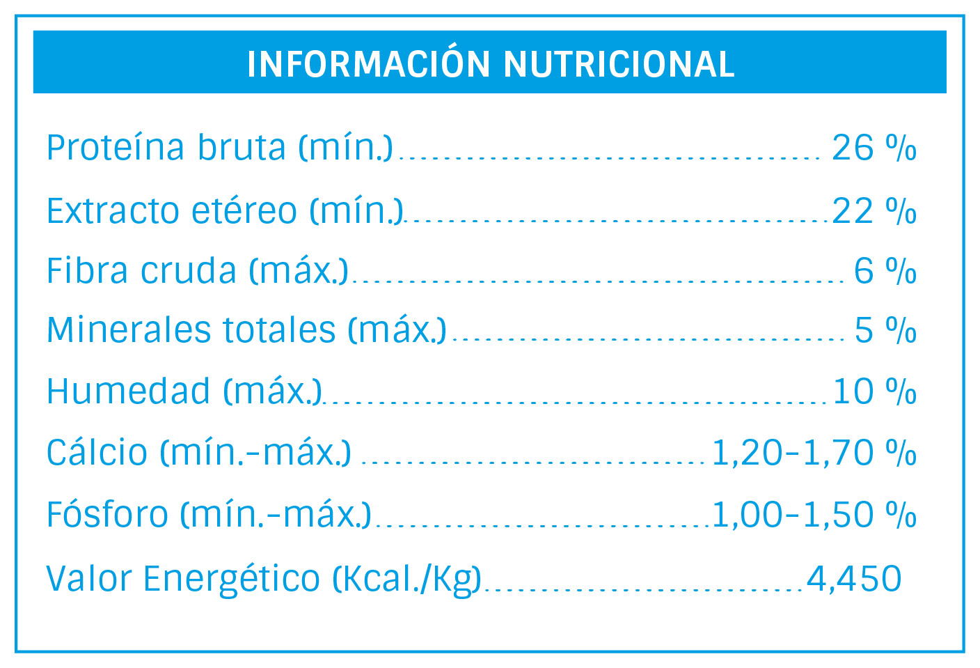 Sus materias primas son de alta digestibilidad y biodisponibilidad, con lo cual se evita la sobrecarga intestinal. Cubre con holgura las necesidades de Vitaminas y Minerales.